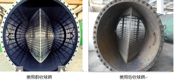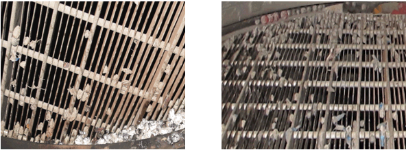 2.3、检修清理时发现有一部分胶球卡在格栅之间,收球网格栅间距变形,有部分胶球流失。